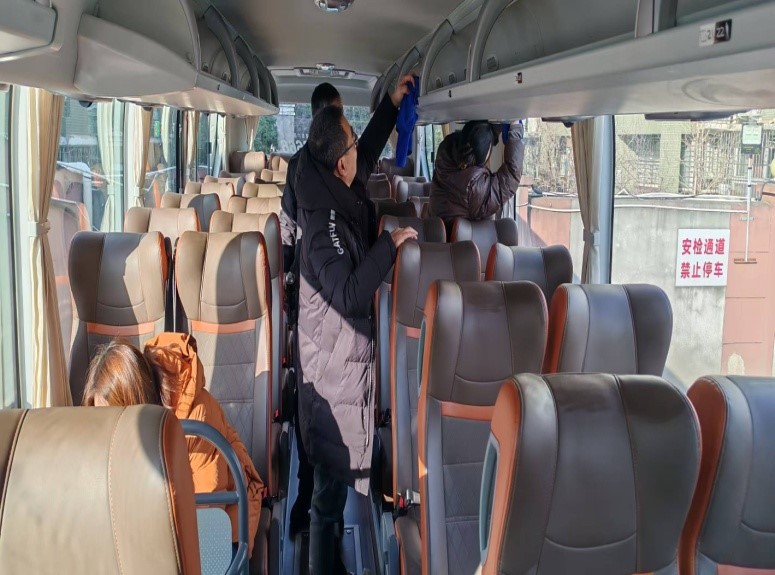 活动中,党员们亮身份、作表率,密切配合,分工协作:除去行李架边角积尘,清理座椅缝隙杂物,拖洗车厢过道地板,逐片擦拭车窗玻璃,深度清洁卫生死角和盲区......冬日清晨气温偏低,但服务热忱丝毫不减,团队全程以“毫米级”精细标准深度作业,打造安全舒适、整洁明净的乘车空间。