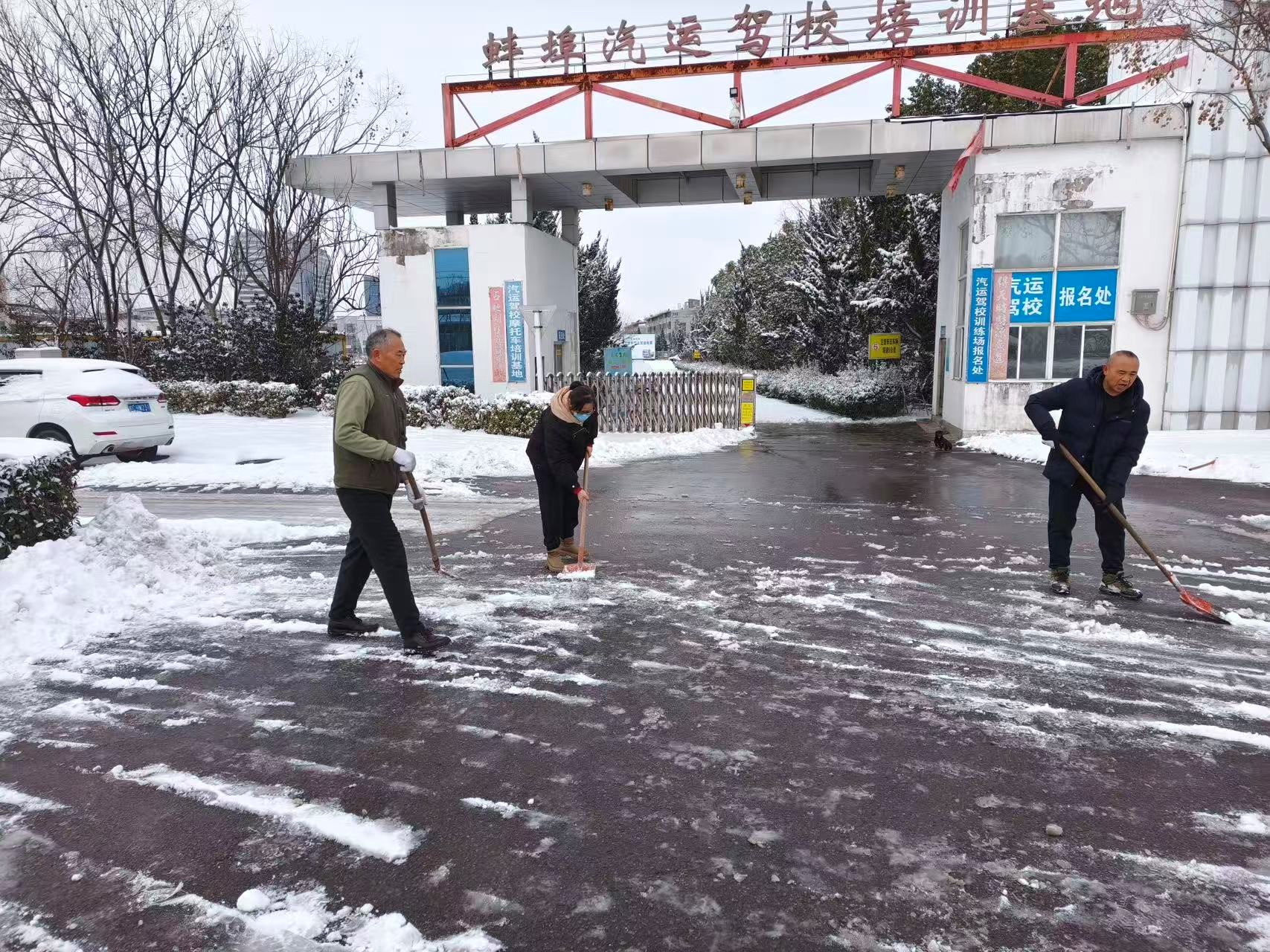 活动现场,党员干部率先“迎战”,带领职工们迅速投入工作:大家手持铁锹、扫帚等工具,分工明确、默契配合,奋力铲除场地主干道积雪,开辟安全通道;仔细清理训练车位、坡道等关键区域冰层,防止学员训练时滑倒。不畏严寒,“热力”十足。